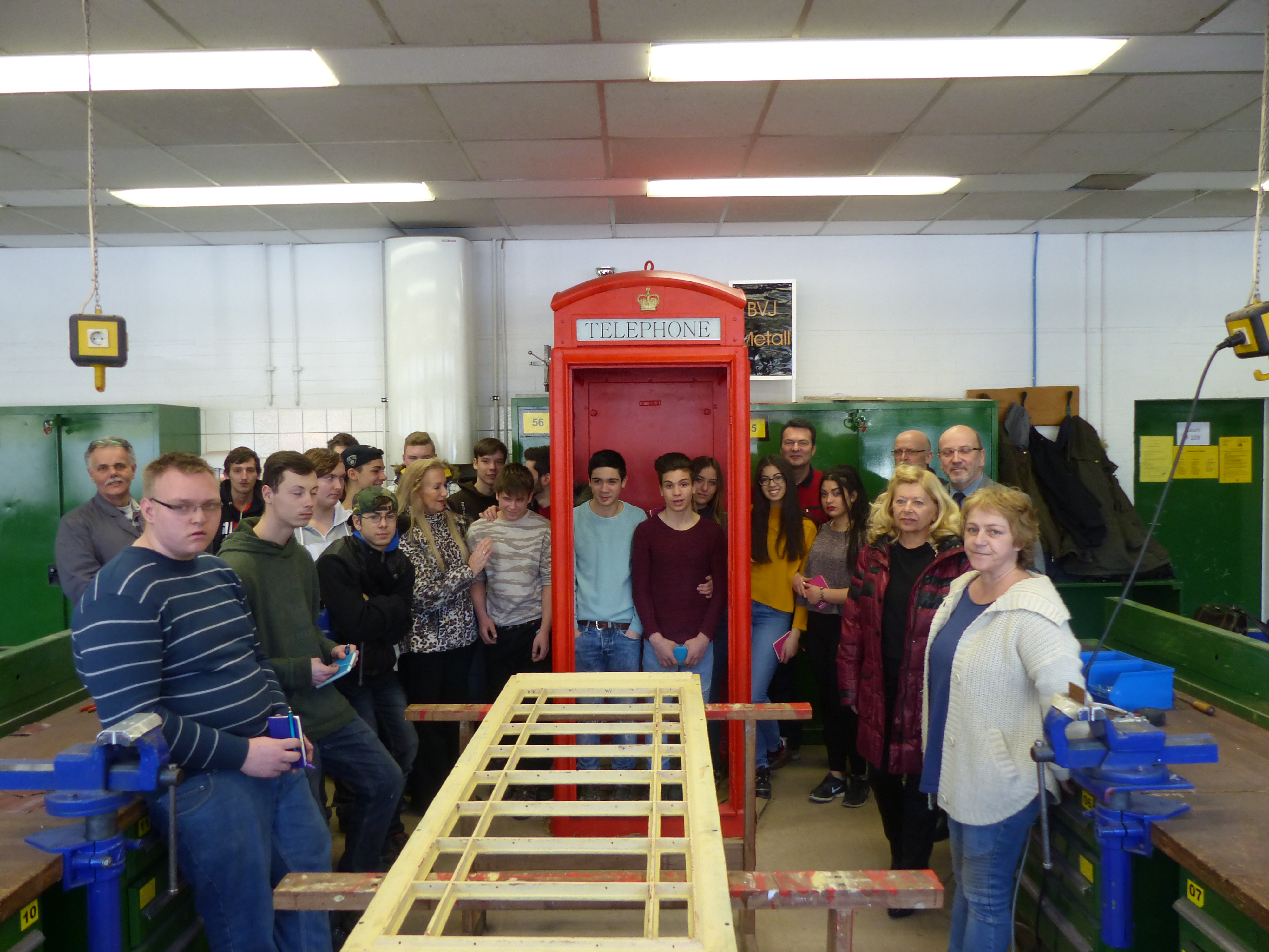 Vor einigen Monaten verschwand die Telefonbox dann – aber nicht zum Verschrotten. Sie kam in die Alice-Salomon-Schule, wo Schülerinnen und Schüler des Berufsvorbereitungsjahres sich unter Leitung der Lehrer Klaus Mallmann (Metalltechnik) und Wolfram Ernst (Holztechnik) um die Restaurierung kümmern. Für die jungen Leute ist es der erste Kontakt mit einer Telefonzelle, und sie widmen sich mit Feuereifer ihrer Aufgabe. Gemeinsam wird der rote Anstrich, die Glasscheiben und das komplette Innenleben erneuert. Die Arbeit in solchen Projekten gehört zum pädagogischen Konzept des Berufsvorbereitungsjahres . Die Schülerinnen und Schüler sollen damit „Sinnperspektive“ und „Selbstwirksamkeit“ erfahren, also den Sinn in ihrem Tun entdecken und merken, dass sie den Unterricht sowie das Ergebnis desselben aktiv mitgestalten können.